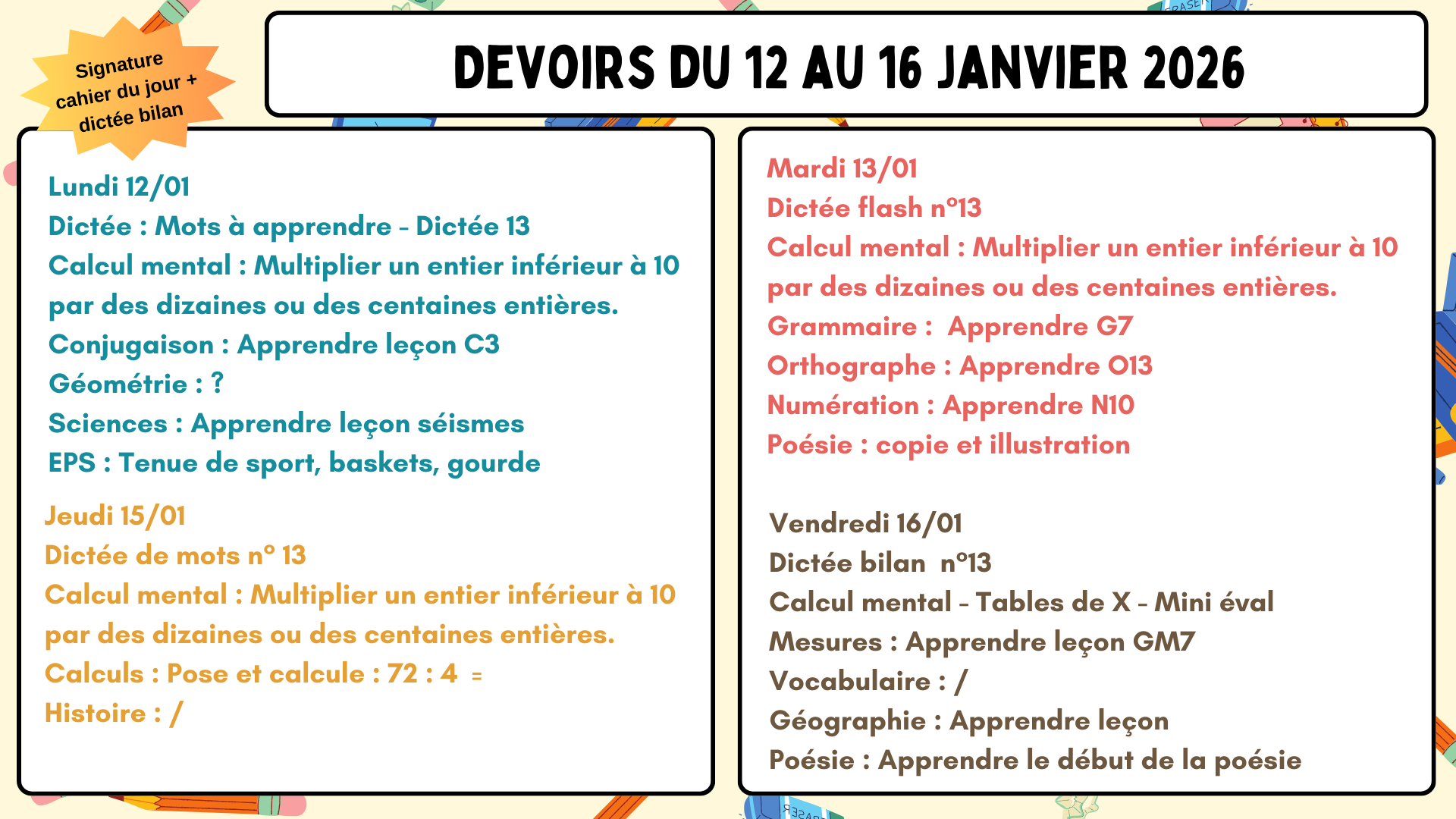 DEVOIRS SEMAINE DU 12 au 16 JANVIER 2026